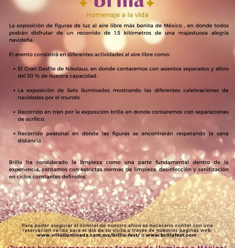 Atlixco, nuevamente estará llena de la luz. Te esperan noches llenas de color que harán que pases una grata estancia, caminando por sus calles que te deslumbrarán a cada paso. “BRILLA” es un recorrido que resalta la belleza arquitectónica de esta ciudad, embelleciéndola con luz.